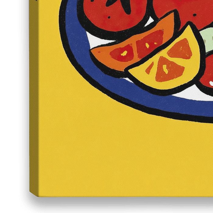 Groente Fruit - Dit kleurrijke schilderij toont een bord vol met groente en fruit, waaronder tomaten, broccoli, en een zonnig gebakken ei, op een achtergrond van levendig geel, waardoor het geheel een vrolijke keuken sfeer uitstraalt.