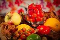 Snoeptomaten in een glas geplaatst in een arrangement van groente en fruit in een decor van bladeren met herfstkleuren.