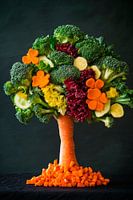 Een creatieve groenteboom die schittert in weelderige groentinten wordt vergezeld door heldere wortelen en kleurrijke bloemen. Deze artistieke compositie wekt de eetlust en levensvreugde op. Perfect voor in de keuken, het brengt een vleugje frisheid en gezondheid in de culinaire sfeer en inspireert tot gezonde gerechten!