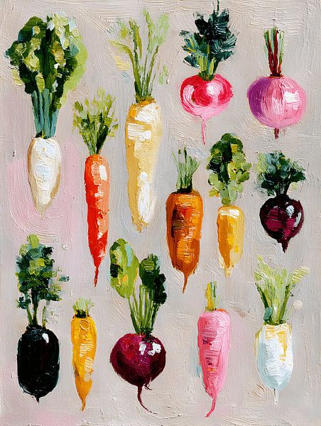Een speelse illustratie van verse groenten, geïnspireerd op de sfeer van een lokale boerenmarkt. De losse penseelstreken en zachte achtergrond geven dit werk een ambachtelijk en vrolijk karakter. Perfect voor de keuken, eetkamer of een creatieve ruimte.