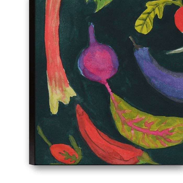 Abstract gestileerde groenten op een donkere achtergrond. Deze vrolijke kleurrijke groenten in mooie, warme levendige kleuren vormen samen een cirkel maar ook een groente stilleven op zwarte aarde in de moestuin. Leuk om deze rijk uitgestalde oogst een plekje te geven in de biologische keuken. Of ergens aan de muur mensen die houden van hun groentetuin of de biologische voeding & landbouw