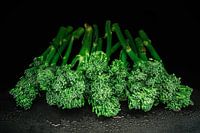 Ik wilde de absolute versheid van dit motief vastleggen. De slanke stelen van de wilde broccoli liggen op een diepzwarte achtergrond die het heldere groen letterlijk laat schitteren - bijna als smaragden in het donker. Als je goed kijkt, herken je de fijne waterdruppeltjes op de achtergrond en de roosjes.