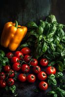 De sappige rode tomaten en het levendige geel van de paprika's, omlijst door aromatische basilicum, schitteren in een fris kleurenspel. Deze levendige compositie brengt een vleugje natuur en smaak in elke keuken, ideaal om de verwachting van heerlijke gerechten op te wekken en een uitnodigende sfeer te creëren.