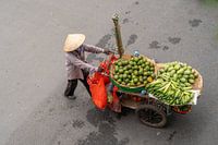 Een belangrijk deel van het leven in Vietnam vindt op straat plaats. Overal en op allerlei manieren proberen de Vietnamezen hun handelswaar te verkopen. Op stoepen en pleinen, lopend fietsend en rijdend. Deze vrouw met haar karakteristieke Vietnamese hoed heeft een handkar waar ze groente en fruit op heeft uitgestald.