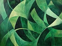 Groenvormen - Dit abstracte schilderij toont een harmonie van overlappende groene en donkergroene vormen, waardoor een dynamisch en vloeiend plantaardig motief ontstaat.