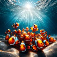 Dit beeld, gemaakt met de hulp van DALL-E, introduceert ons in de fascinerende onderwaterwereld en toont een groep levendige clownvissen die nieuwsgierig omhoog turen in het brekende zonlicht. De zonnestralen breken door het heldere blauw van de zee en creëren een sprankelend schouwspel dat het leven in de oceaan verlicht. Clownvissen staan bekend om hun symbiotische relatie met anemonen en hun levendige kleuren, die hier helder worden weergegeven.