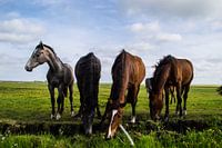 Paarden in de wei aan het grazen naast elkaar bij de sloot
