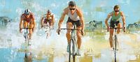 Details: sport schilderij, wielrenners schilderij, wielrennen, fietsen, kunst, actie, snelheid, mannen, pastel kleuren, moderne kunst