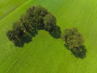 Groepje eiken en berken in een vers gemaaid weiland tijdens een mooie zomerdag in Overijssel, Nederland, van bovenaf gezien