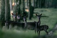 Een prachtig groepje damherten met jongen op de veluwzoom. Het avondzonnetje schijnt achter nog iets door de bomen. Een prachtig tafereel om vast te leggen.