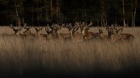 Groep mannetjes edelherten in het hoge gras tijdens zonsondergang. Donkere bos achtergrond. Foto is op de Hoge Veluwe in Nederland genomen.