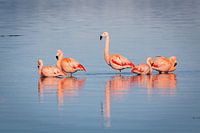 De foto toont een groepje van 5 Chileense flamingo's die in het water staan van een fjord in Patagonië in het zuiden van Chili. Het water van de zee is rustig zodat een fraaie weerspiegeling van de roze flamingo's ontstaat.