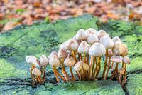 Groep paddestoelen op groene boomstronk in herfst. In het najaar is het jaargetijde dat de schimmels in een vochtige omgeving gaan bloeien. Ze vormen hun vruchtlichamen, dat zijn de paddestoelen.