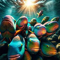 In het hart van een onderwaterwereld, verlicht door de zachte zonnestralen die door het wateroppervlak breken, ontvouwt zich een prachtig panorama: een groep papegaaivissen waarvan de levendige kleuren afsteken tegen het diepe blauw van de oceaan. Dit beeld, gemaakt door DALL-E in een betoverende fusie van surrealistische en digitale kunst, belichaamt moderne kunst met een blik op de diverse wonderen van de zee.
