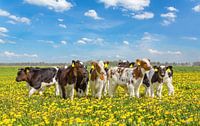 Groep pasgeboren kalveren in Nederlands weiland met bloeiende gele paardenbloemen. Groep jongvee als jonge landbouwhuisdieren in bloemenweide op zonnige dag in lente. De kudde met roodbonte en zwartbonte dieren geeft een kleurrijke landschapsfoto samen met de blauwe lucht en witte wolken.