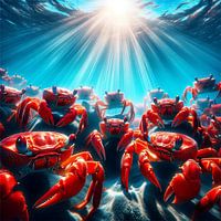 Rode krabben, bekend om hun massale migraties op het land, zijn hier afgebeeld in een zeldzame onderwaterscène die hun collectieve gratie en synchroniciteit benadrukt. Deze schaaldieren, vaak een symbool van transformatie en bescherming, worden in dit surrealistische kunstwerk vereeuwigd in een moment van rust.