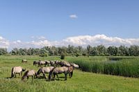Groep wilde Konik paarden in de Oostvaardersplassen in Flevoland tijdens een mooie zomer dag.