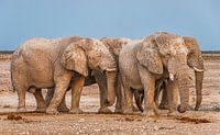 Dit werk toont een groepje Afrikaanse olifant stieren (Loxodonta africana) in de half woestijn van Etosha National Park in Namibië. Het terrein is droog en stoffig en laat de enorme omvang en de ruwe huid van de Olifanten goed tot recht komen. De heldere lucht contrasteert fraai met de aardse tinten van de grond en de Olifanten en benadrukt de ruige schoonheid van hun leefgebied.