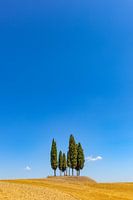 Een groepje bomen rondom een kruis en het wijdse landschap van Toscane in Italie. Less is More!!