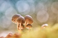 Een klein groepje paddenstoelen schuin van onderen gefotografeerd, zodat de lamellen mooi zichtbaar zijn. In een van de paddenstoelhoedjes zit een heel klein spinnetje. Door het tegenlicht valt het licht door de hoedjes en zorgt voor een mooi bokeh in de achtergrond. Gekozen voor een warme kleurstelling.