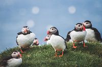Close up van een groepje papegaaiduikers op de Faeröer eilanden. Het eiland Mykines op de Faeröer Eilanden is een van de beste plekken in Europa om papegaaiduikers (of puffins) te spotten.