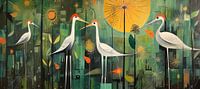 Groet van de Zonnestralen - speelse ooievaars, kleurrijk dierenkunstwerk, levendige vogelschilderij