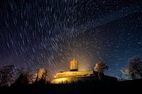 Sterrensporen boven kasteel Steinsberg in Sinsheim. Aan de overkant van de foto staan de sporen van ongeveer 60 Starlink-satellieten die enkele dagen eerder door SpaceX werden gelanceerd.