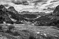 Vergezicht in het Val Gardena vanaf de top van de Passo Gardena in de Italiaanse Dolomieten