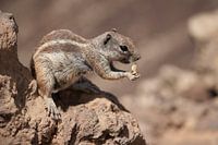 Knabbelende grondeekhoorn op rand van vulkaan op het Canarische eiland Fuerteventura.