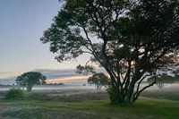 Grondmist op de heide. De zon moet nog opkomen. De krentenbomen steken mooi af tegen de lucht.
