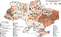Een topologische kaart van Oekraïne toont de geografische verdeling van de belangrijkste grondstoffen in het land, zoals steenkool, ijzererts, gas, olie en agrarische producten. De reliëfverschillen worden benadrukt, waardoor het industriële Donbas-gebied, de rijke landbouwgebieden van het zuiden, en de energievelden van het oosten zichtbaar worden. Kleurcodes en symbolen duiden op specifieke grondstoffen en hun concentraties binnen het landschap.