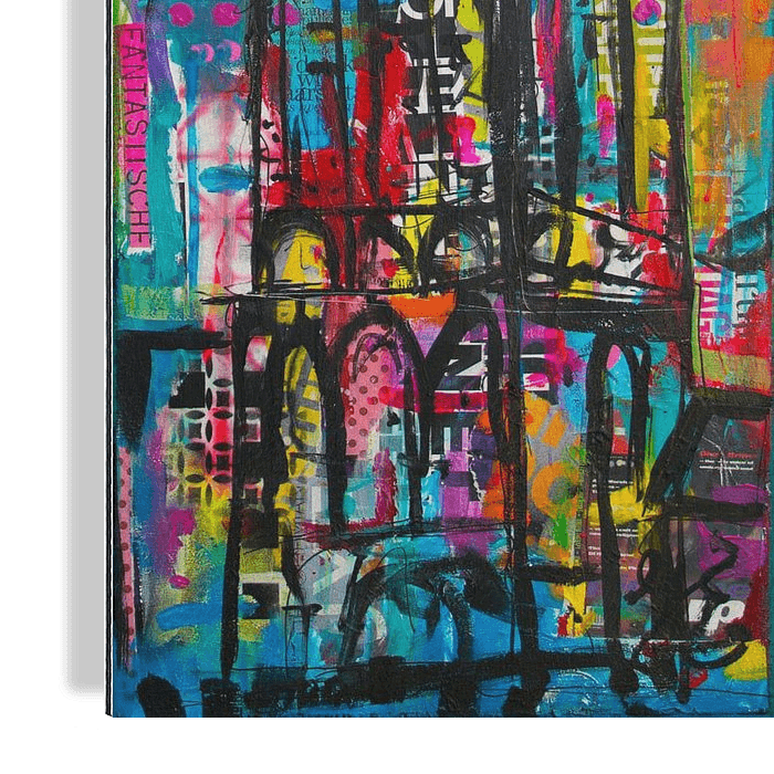 De achtergrond is met mixed media opgebouwd (papier, acryl en inkten).