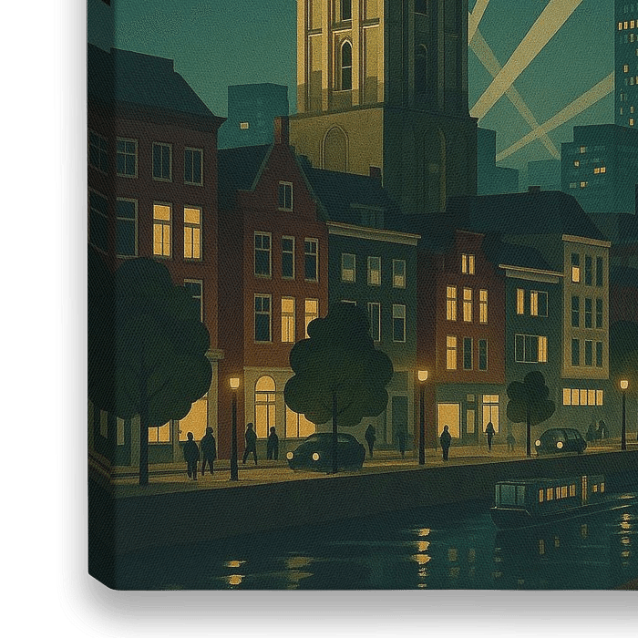 Deze Groningse poster toont de levendige mix van geschiedenis en het moderne leven in het noorden van Nederland. Centraal staat de Martinitoren, de iconische toren van de stad, trots tegen een nachtelijke hemel verlicht met gestileerde lichtstralen. Daaromheen staan historische herenhuizen en hedendaagse stadsgebouwen die het dynamische…