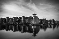 De bijzonder mooie gekleurde huizen van de nieuwe wijk Reitdiep in Groningen, echter hier in zwart wit gefotografeerd.