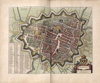Oude kaart, plattegrond, index en wegenkaart van de stad met de verdedigingswerken, wateren, pleinen en markten. Verder de kerken, windmolens en stadsmuur of stadswal.