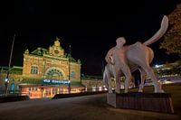 Nachtfoto van het Groningen Station met het Peerd van Ome Loeks