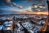 Uitzicht over een winters Groningen net voor zonsondergang. De foto is genomen vanaf de eerste trans van de Martinitoren tijdens de winter van 2009. Voor het Stadhuis op de Grote Markt is het Glazen Huis van 3FM Serious Request te zien.