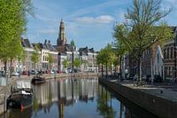 Op deze foto is het een mooie zomerse dag, met weinig wind, waardoor het hele tafereel zich ook nog eens mooi spiegelt in het Reitdiep. Het zonlicht valt mooi op de huizen en de Der Aa-kerk