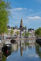 Op deze foto is het een mooie zomerse dag, met weinig wind, waardoor het hele tafereel zich ook nog eens mooi spiegelt in het Reitdiep. Het zonlicht valt mooi op de huizen en de Der Aa-kerk
