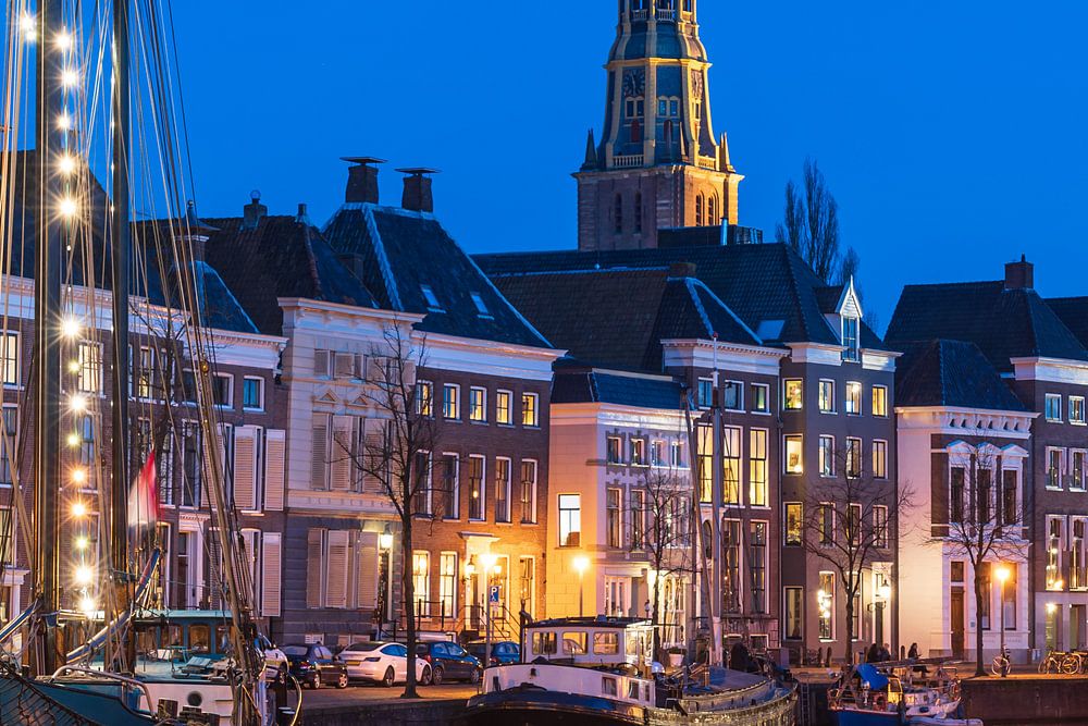 Oude schepen in de Lage der A en de toren van de Aa-kerk in het centrum van Groningen op een mooie avond in de winter.