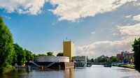 Het Groninger Museum gezien vanaf de Stationsweg, inclusief de loopbrug er naar toe.