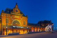 Stationsgebouw van Groningen en het "Peerd van ome Loeks" tijdens het blauwe uur.