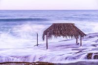 De Surf Shack met rieten dak staat wankel op een rotsachtige kustlijn terwijl er turbulente golven omheen stromen. Door de lange belichtingstijd lijkt het water glad en mistig, in contrast met de statische structuur. Van Windansea Beach in La Jolla, Californië. Bedankt voor uw interesse in mijn werk