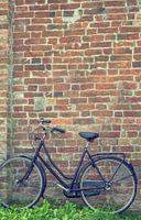 Fiets geparkeerd tegen de oude bakstenen muur van een kerkje