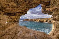 Een indrukwekkende rotsformatie aan de kust van Cyprus, de grot op de foto kan worden bereikt door te klimmen, het uitzicht naar zee is indrukwekkend.
