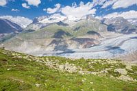 Grote Aletschgletscher nabij Bettmeralp gezien vanaf Riederalp met alpenrozen in de voorgrond en een prachtige wolkenlucht