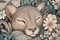 Grote Kat | Slapende Kat - Op dit dieren schilderij zie je een rustig slapende grote kat omringd door bladeren en bloemen, wat een zenachtige sfeer geeft aan het kunstwerk.