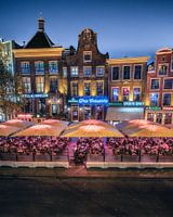 Prachtige monumentale panden achter het populaire terras aan de Grote Markt in Groningen. De neon verlichting van de horecagelegenheden geeft in combinatie met het schemerlicht veel sfeer aan deze locatie.