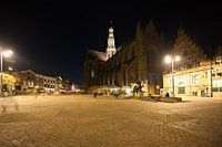 Grote markt Haarlem nachtfoto met de Bavo op de achtergrond verlicht en de grote Markt in het licht van de straatverlichting.
