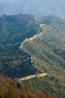 Grote Muur op de Bergen in de HerfstDe muur gaat door de toppen van de heuvels bedekt met bos. Heldere gele schoonheden van de herfst, oude stenen.